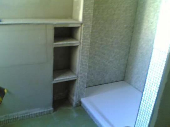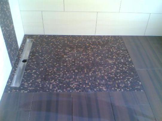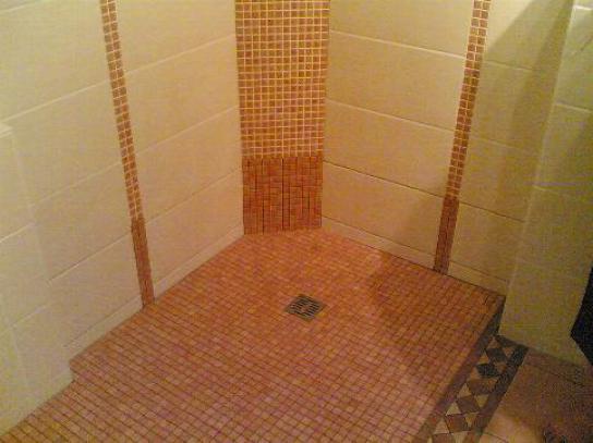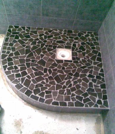 Duschecke aus Mosaik mit integriertem Abfluss. Der Boden und das Mosaik sind zu diesem Zeitpunkt noch nicht