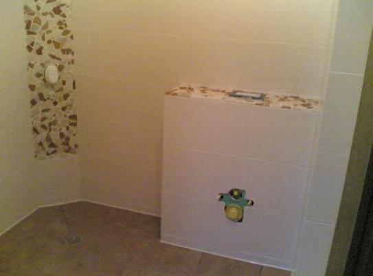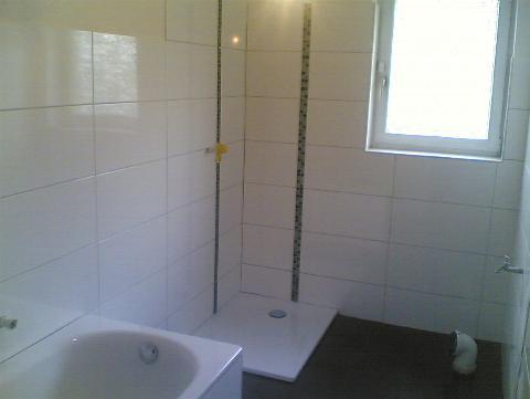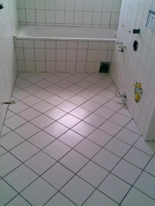 Der Klassiker, ein simples Badezimmer aus weißen Fliesen. Unverfugt und nicht fertig gestellt.