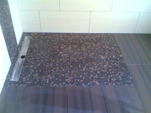 Duschecke mit Mosaik gefliest. Der Abfluss ist in den Boden eingelassen. Der Bereich ist teilweise noch nicht verfugt und nicht versiegelt.
