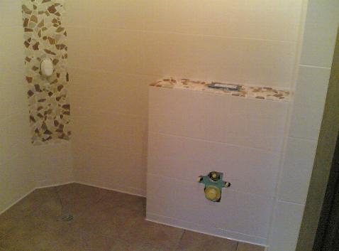 Erhöhte Duschecke gefliest mit Natursteinbruch.